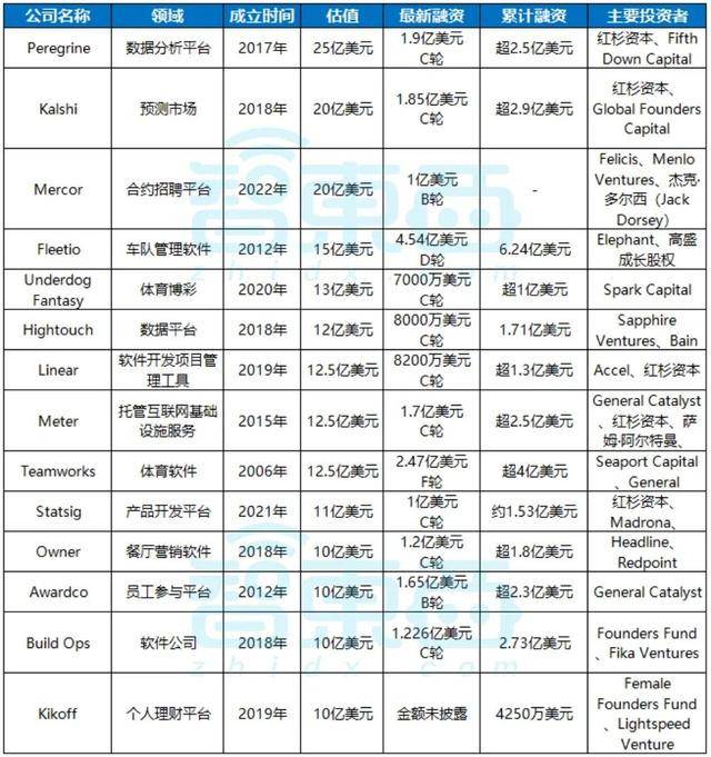 在软件与平台公司方面,有14家企业跻身独角兽行列,覆盖数据分析、区块链交易、招聘平台、车队管理、体育科技、软件开发工具等多个领域。其中数据分析平台Peregrine以25亿美元(约合人民币179.3亿元)估值领跑,Kalshi、Mercor等企业紧随其后,估值均达20亿美元(约合人民币143.4亿元)。